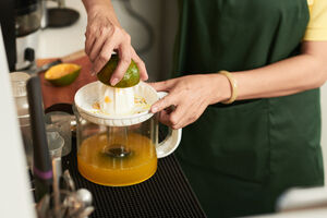 Cropped image of Vietnamese female worker in apron squeezing orange making orange juice for customer while standing in cafe