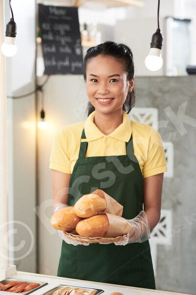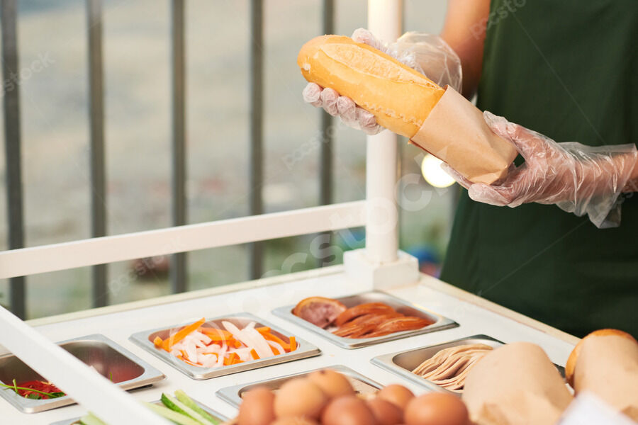 Vietnamese female worker wearing apron and plastic gloves offering plate of sandwiches while standing in local food stall