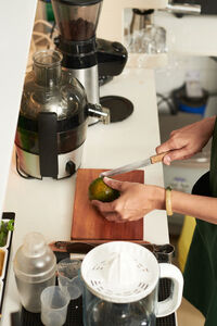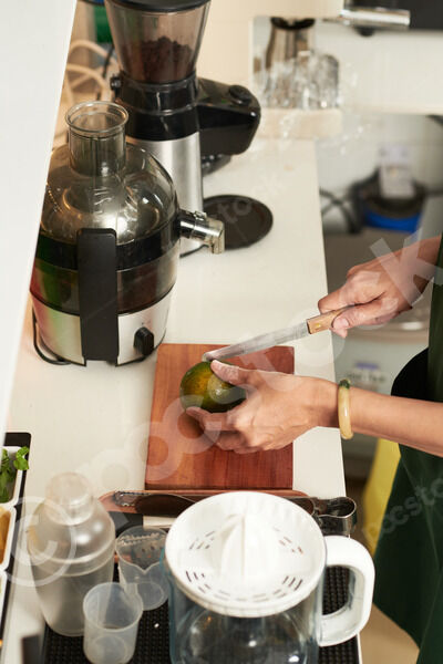 Cropped mage of Vietnamese woman in apron slicing green orange for making juice while standing at counter in an outdoor cafe