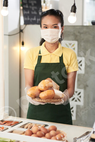 Vietnamese female worker wearing apron, face mask, and plastic gloves offering plate of sandwiches while standing in local food stall