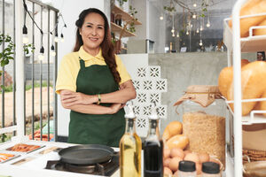 Vietnamese woman in apron standing with crossed arms in her street food cart