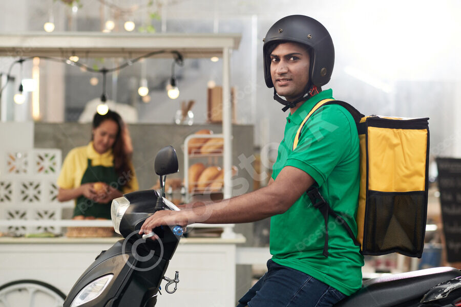 Indian male delivery rider with insulated bag on his back wearing helmet sitting on scooter ready to deliver bread from local bakery