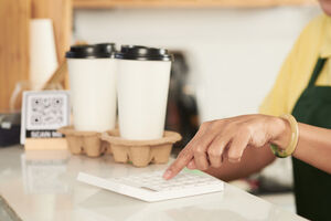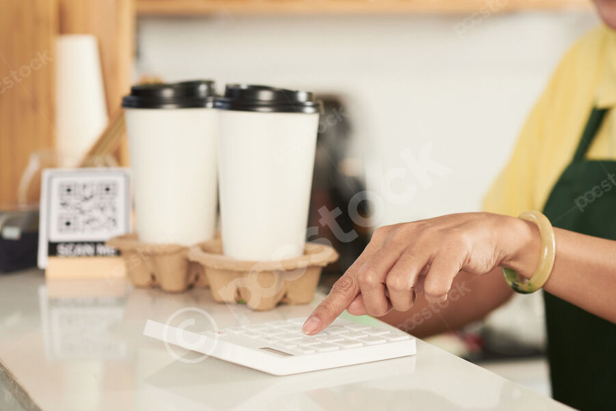 Cropped image of Vietnamese female barista in apron calculating price of order while standing at counter with two take-out coffees in coffeeshop
