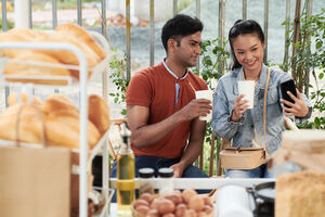 Indian man and Vietnamese woman drinking and taking selfie on smartphone while sitting on bench in an outdoor cafe