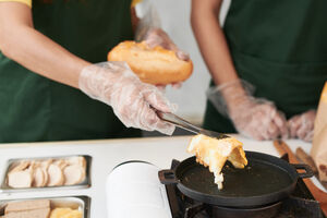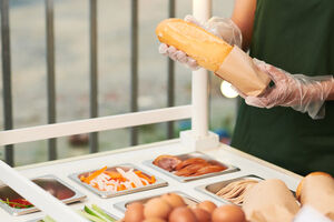Cropped image of vendor in protective gloves putting sandwich in cardboard package