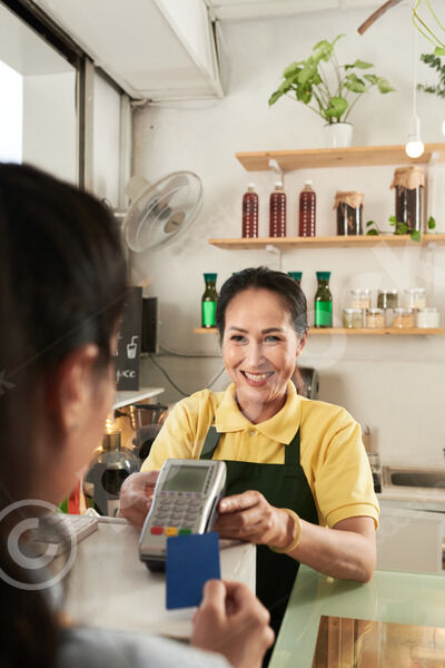 Vietnamese female barista in apron holding POS terminal and accepting credit card payment from customer while standing at counter in cafe