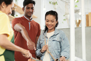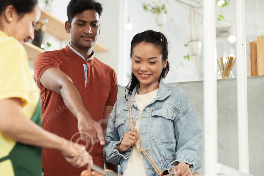 Indian and Vietnamese couple choosing chicken eggs and being assisted by female worker in local market
