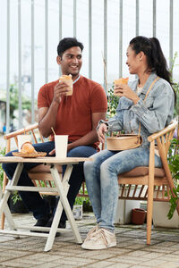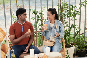 Indian man and Vietnamese woman looking at each other talking and smiling while sitting at table and eating in an outdoor cafe