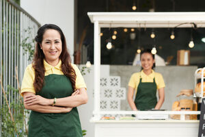 Vietnamese woman in apron standing with crossed arms in her street food cart