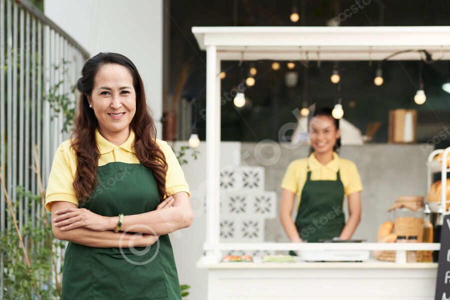 Vietnamese woman in apron standing with crossed arms near food cart with her female colleague in local food stall