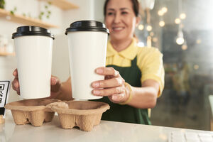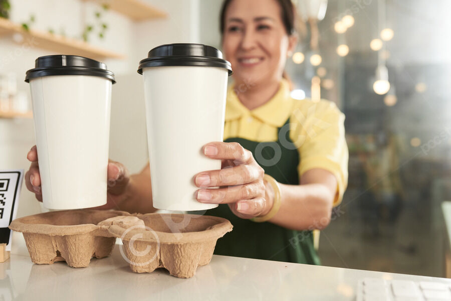 Vietnamese female barista in apron serving two cups of take-out coffee in holder while standing at counter in cafe
