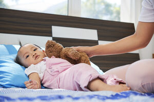 Vietnamese little girl having fun talking to her mother and senior grandmother while sitting together on bench in the garden during daytime