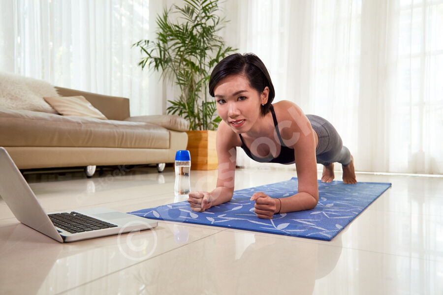 Asian female customer in blue blouse touching tablet screen while rating plumbing service after repair in kitchen at home