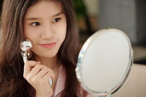 Senior Vietnamese grandmother with hair curlers watching tutorial on smartphone with her daughter and granddaughter at home