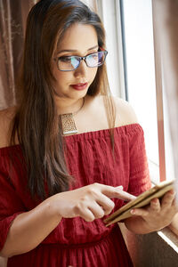 Asian business woman with eyeglasses using tablet standing beside window at home
