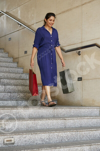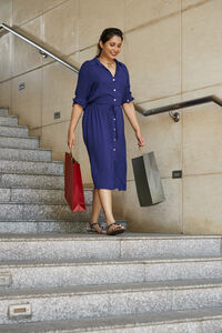 Asian woman in blue dress with shopping bags walking down the stairs outdoors during daytime