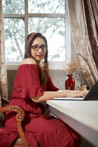 Asian business woman with eyeglasses working on laptop sitting at desk beside window at home