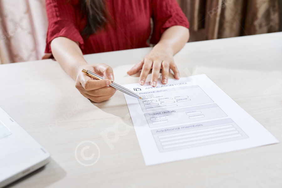 Asian business woman with eyeglasses pointing at document while sitting at desk in office