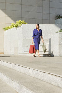 Asian woman with shopping bags looking away while walking in front of the building outdoors during daytime