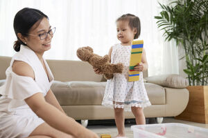 Asian female nurse showing small bottle of medicine to Indian male doctor sitting at desk with tablet in hospital office