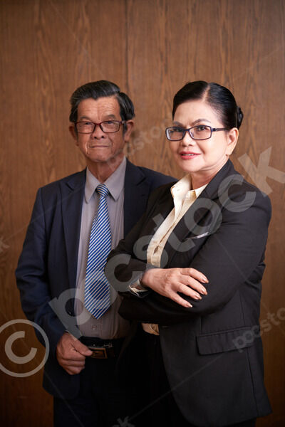 Indian male doctor with arms crossed talking with Asian female nurse holding clipboard standing in hospital