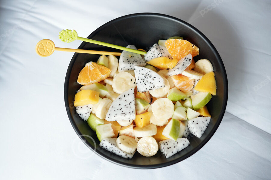Cropped image of Asian woman holding apples standing in front of fruit stall in market