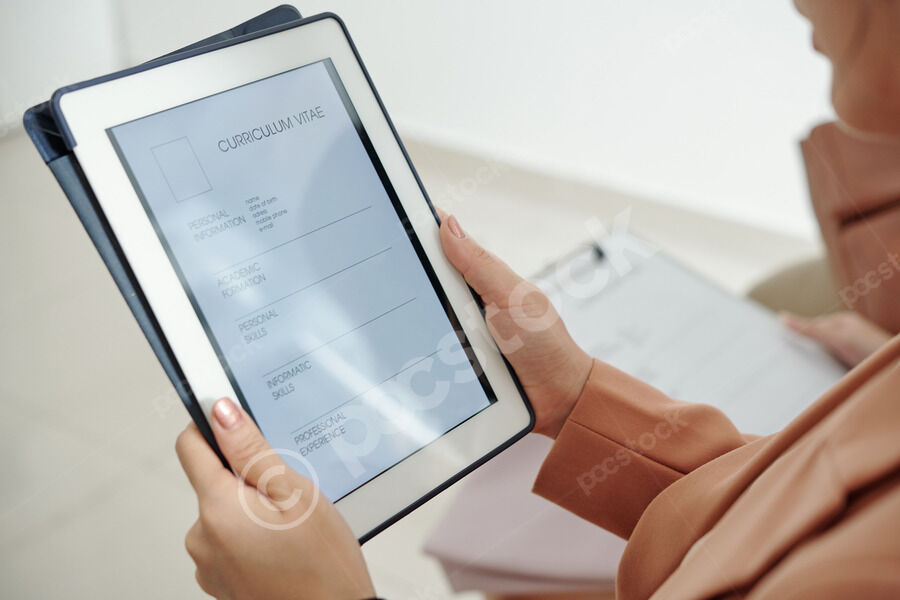 Asian female garden worker holding tablet checking flowers crouching in flower nursery