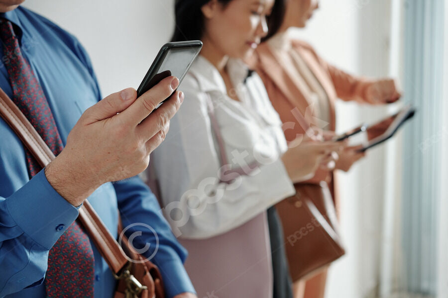 Asian female gardener taking picture of hanging flowers using smartphone standing in flower nursery