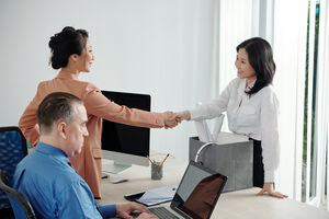 Asian woman holding tablet with male coworker packing plants standing in flower nursery