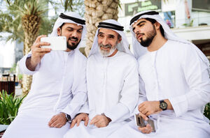 Asian male farmers riding on elephants standing near tree in rice fields at sunrise