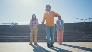 Black male and female friends looking at each other talking while standing in front of stairs in city park on sunny day