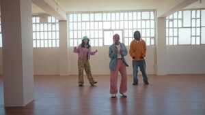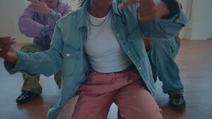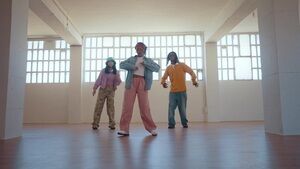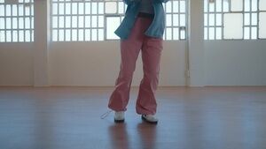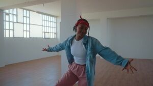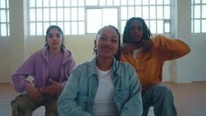 Black male and female dancers sitting on floor watching and cheering their caucasian female friend dancing inside an industrial-style dance studio