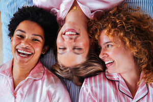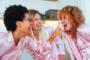 Middle-aged Hispanic businessman talking with female colleagues having fun during lunch break sitting near building in city on sunny day