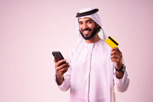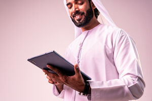 Muslim Indian businessman wearing kandura holding tablet talking with diverse colleagues while walking on city street during daytime