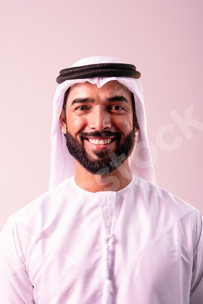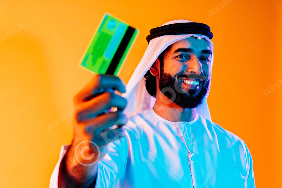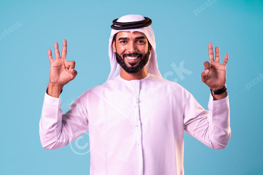 Muslim Indian businessman wearing kandura pointing away walking with diverse business colleagues outside building in city during daytime