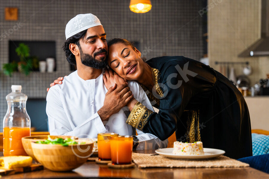 Hispanic woman wearing abaya leaning forward and hugging her Indian husband in kandura sitting at table having lunch at home