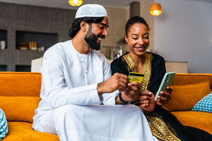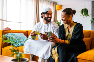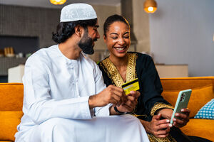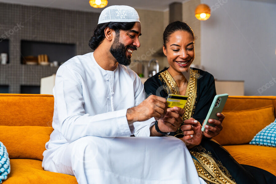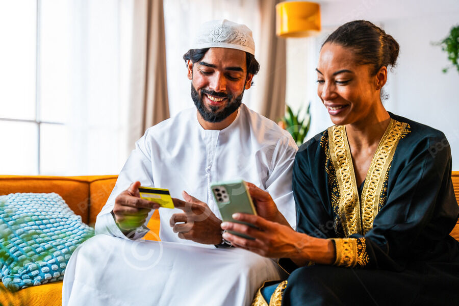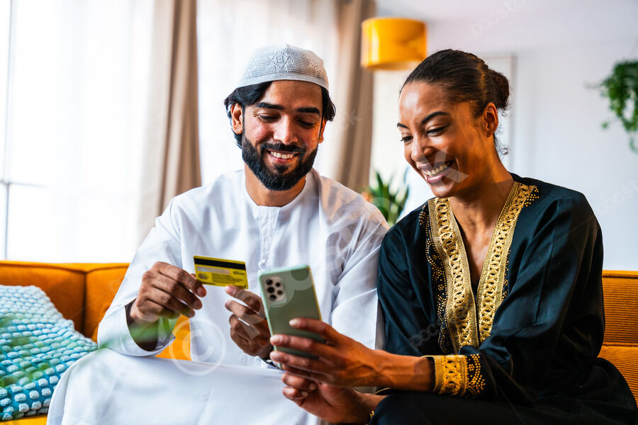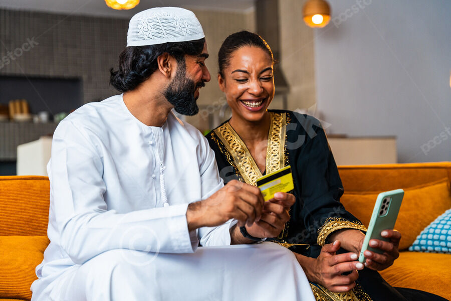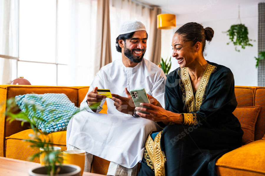 Indian man in kandura and Hispanic wife wearing abaya shopping online using credit card and smartphone sitting together on sofa in living room at home
