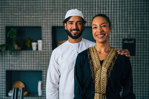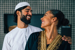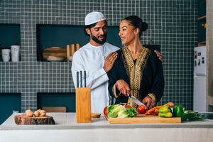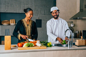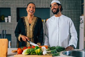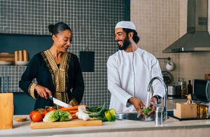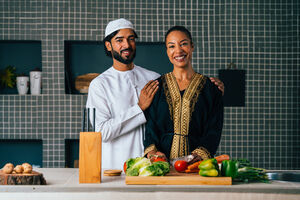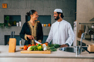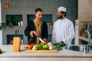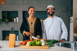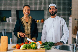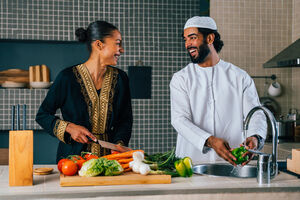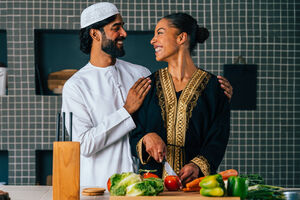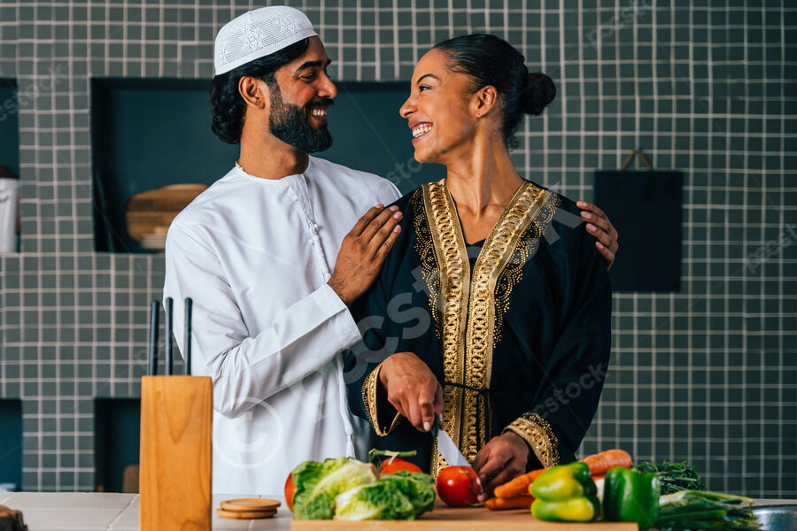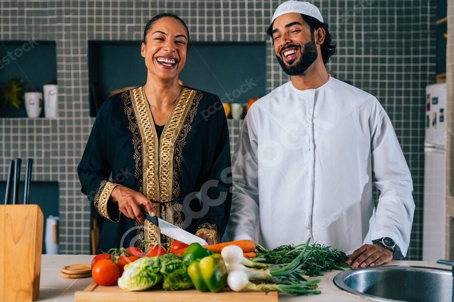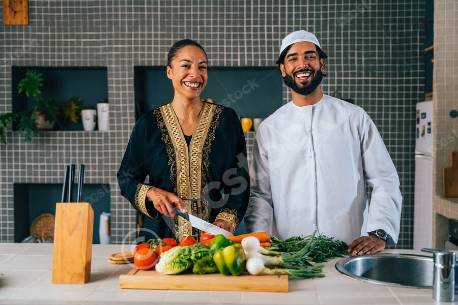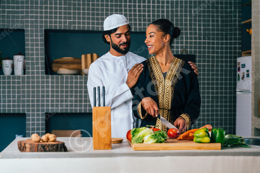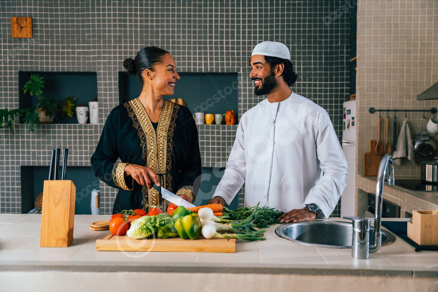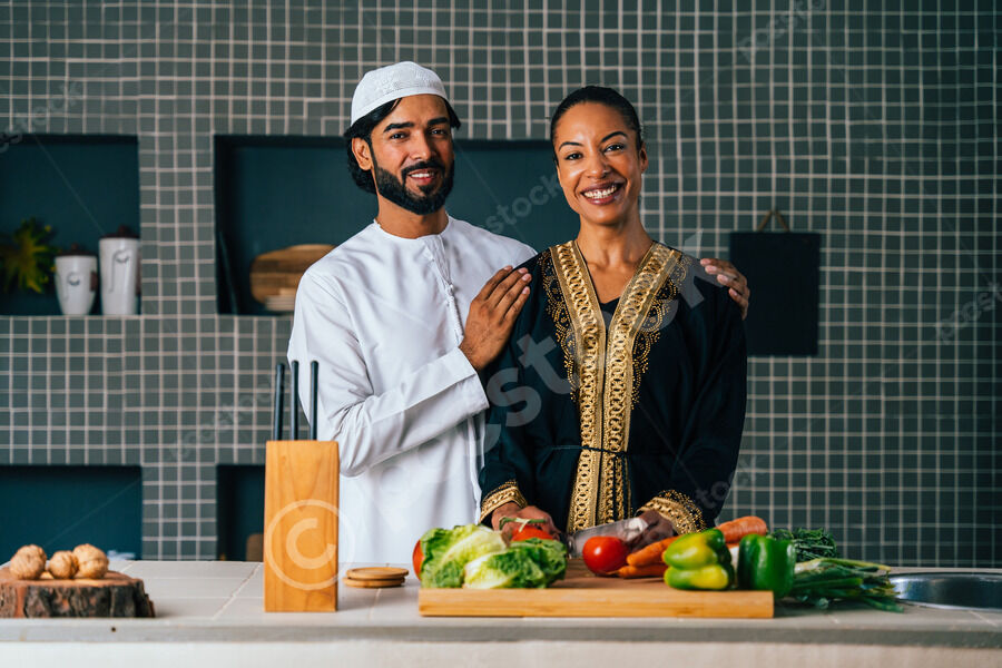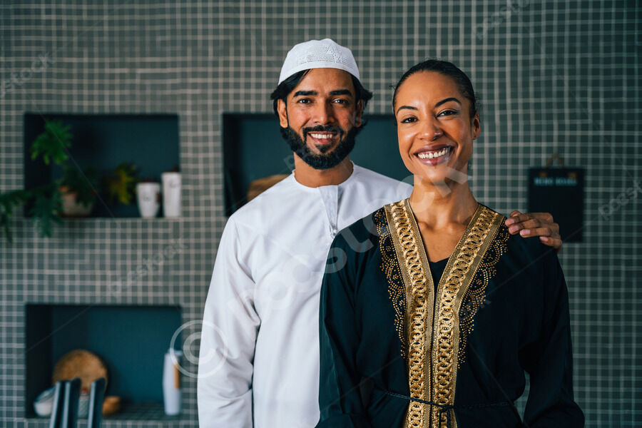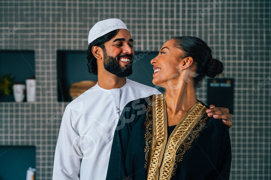Indian man in kandura and Hispanic wife wearing abaya smiling standing in kitchen at home