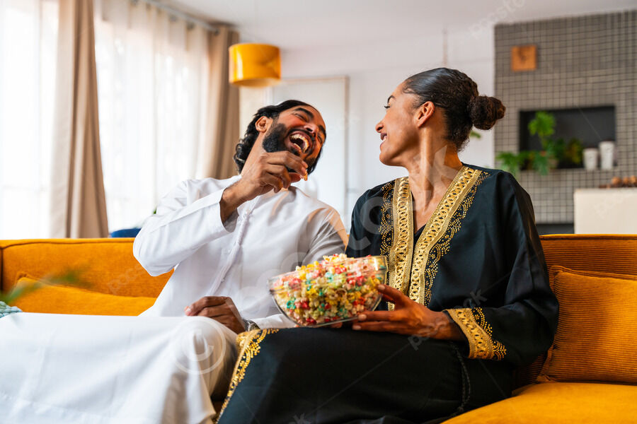 Indian man in kandura and Hispanic wife wearing abaya eating colorful popcorn and laughing while sitting together on sofa in living room at home