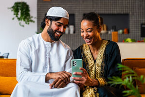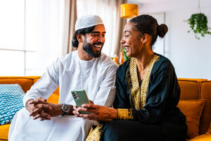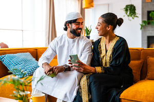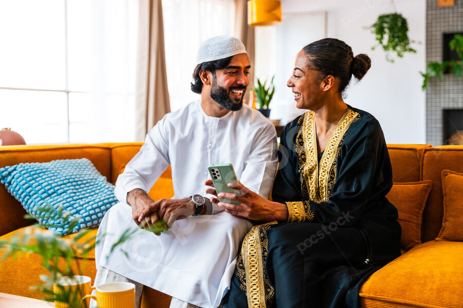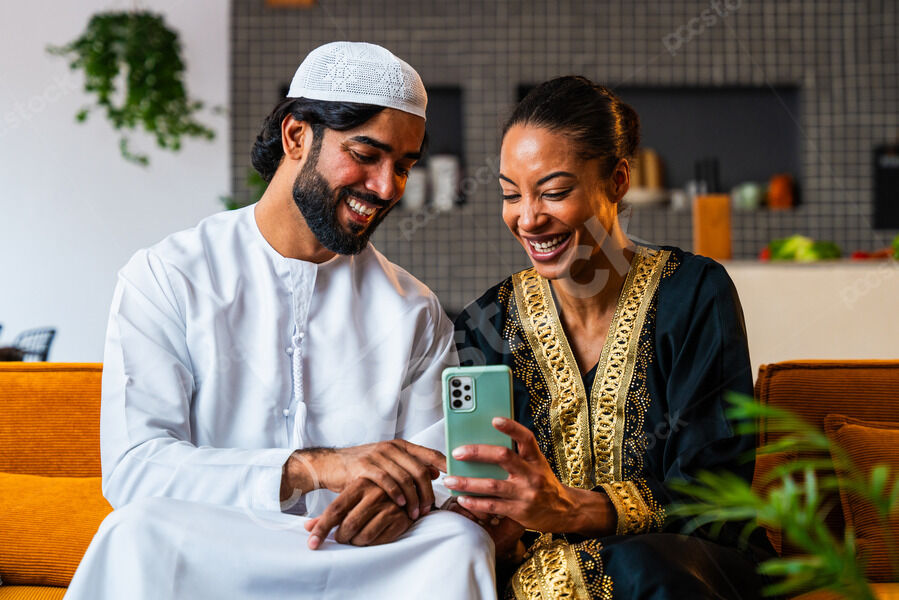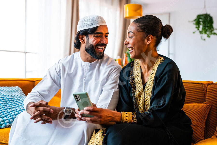 Indian man in kandura and Hispanic wife wearing abaya having fun using smartphone sitting together on sofa in living room at home