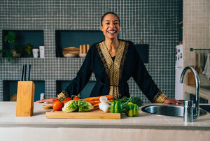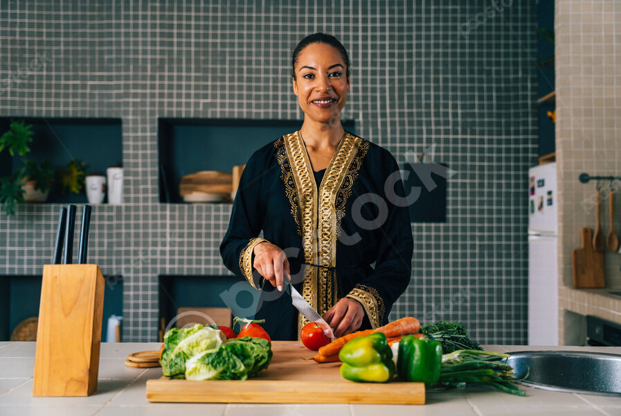 Hispanic woman wearing abaya smiling standing at kitchen counter with vegetables at home