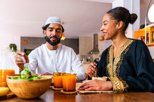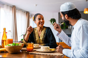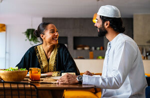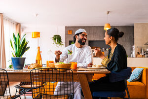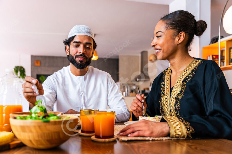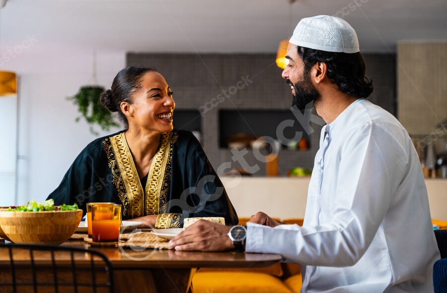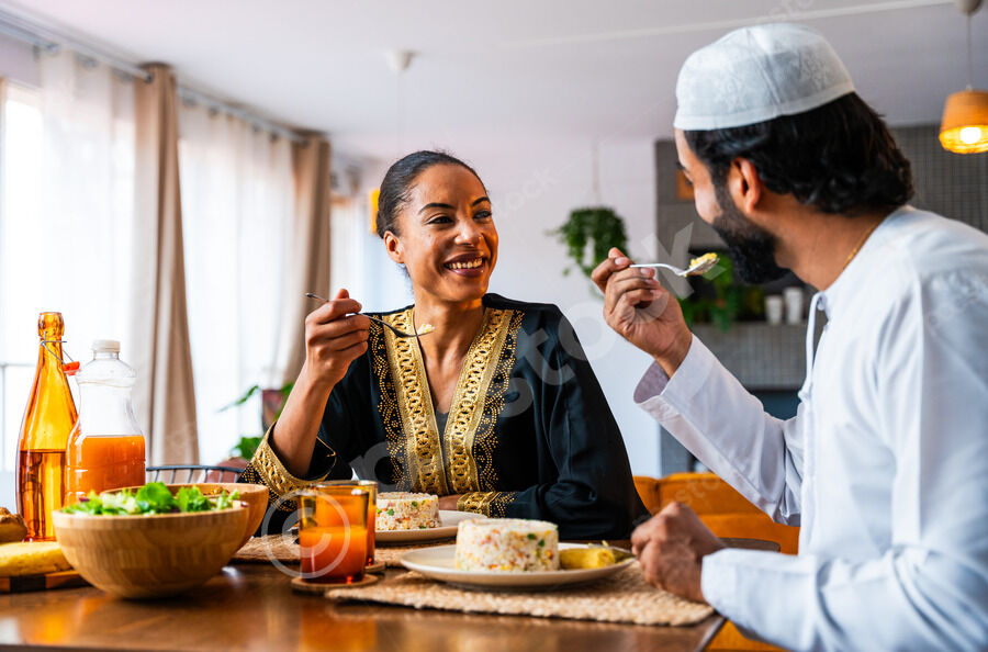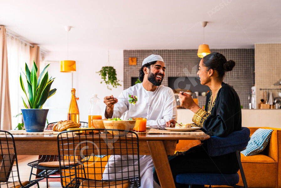 Indian man in kandura and Hispanic wife wearing abaya sitting at table having lunch together at home