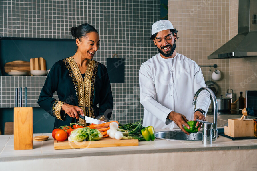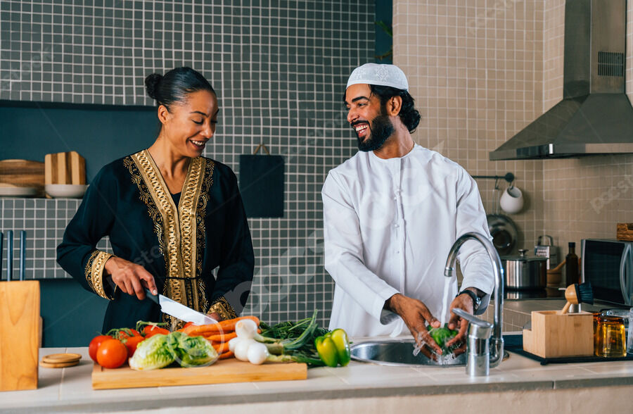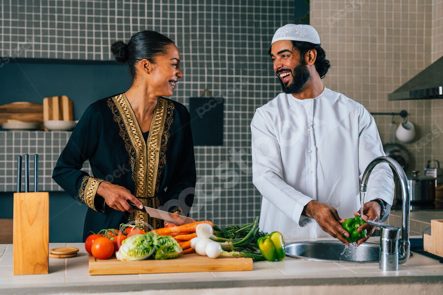 Indian man in kandura and Hispanic wife wearing abaya having fun washing and cutting vegetables while standing at kitchen counter at home
