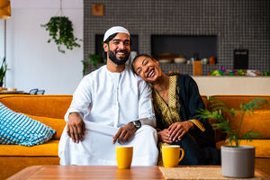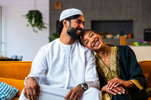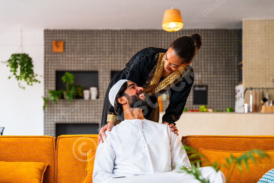 Indian man in kandura sitting on sofa with his Hispanic wife wearing abaya standing behind him in living room at home
