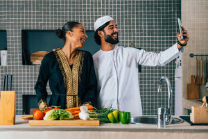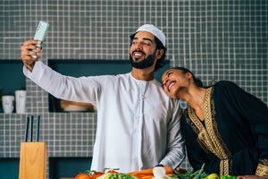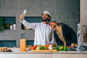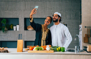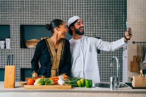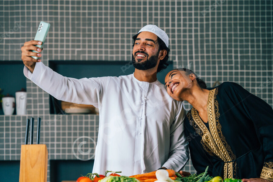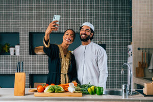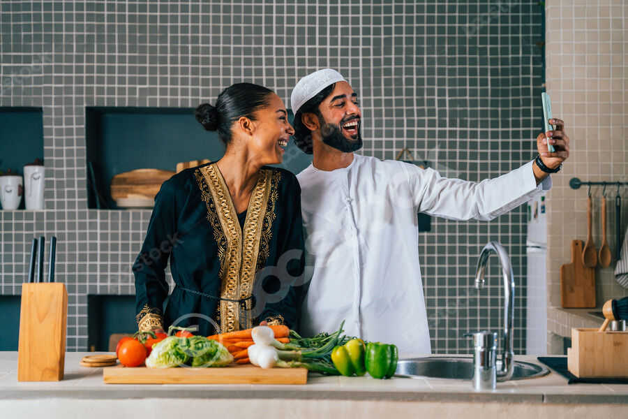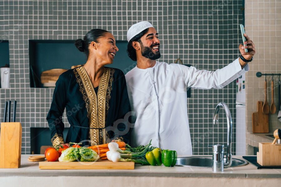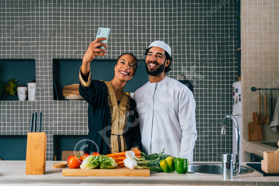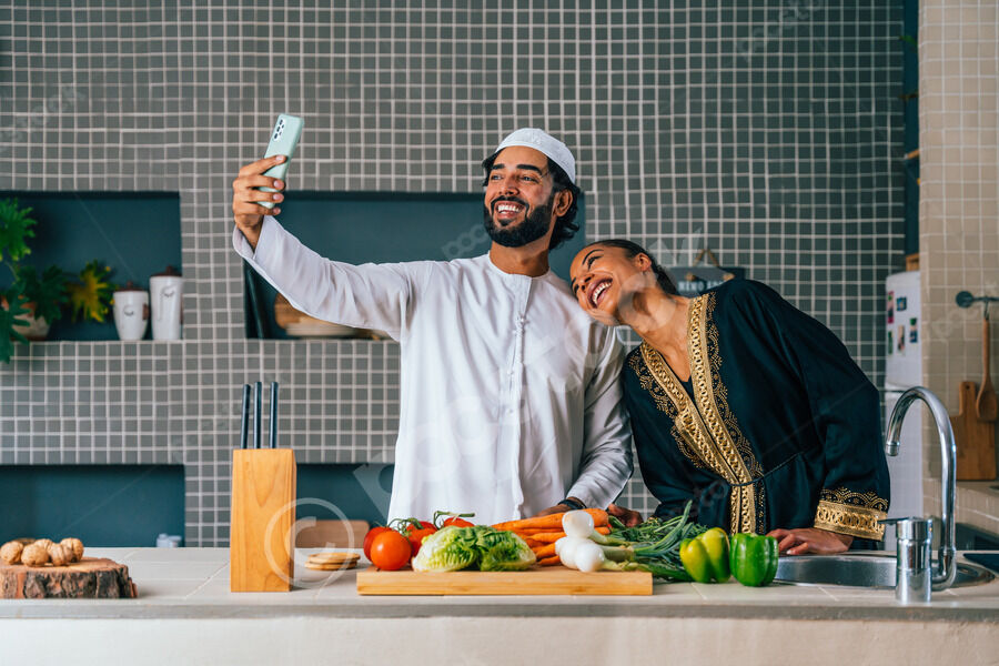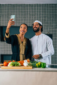 Indian man in kandura and Hispanic wife wearing abaya taking selfie on smartphone while standing at kitchen counter with vegetables at home