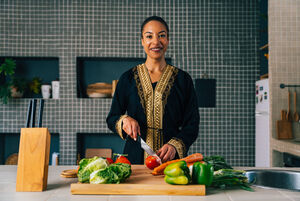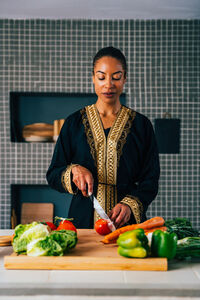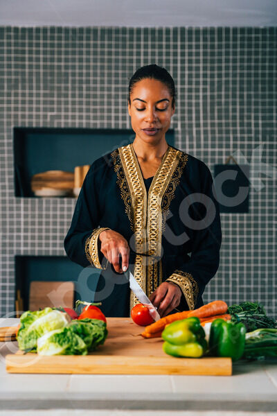 Hispanic woman wearing abaya cutting vegetables while standing at kitchen counter at home