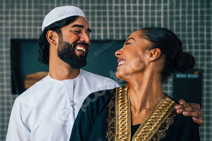 Indian man in kandura and Hispanic wife wearing abaya looking at each other laughing standing in kitchen at home