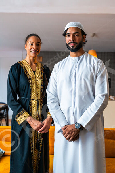 Indian man in kandura and Hispanic wife wearing abaya smiling standing in front of sofa in living room at home