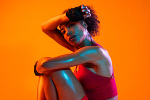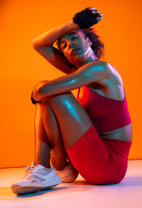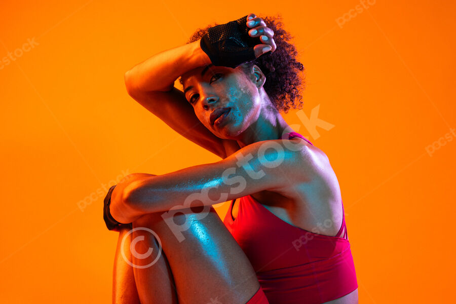 Muscular Hispanic woman in fitness wear and workout gloves wiping her sweat on her forehead while sitting and hugging her legs against orange background in studio