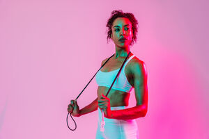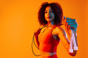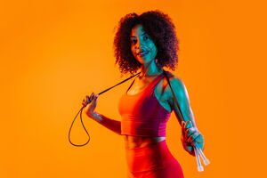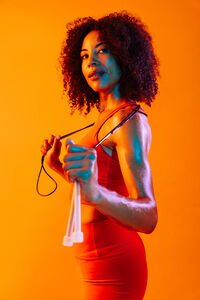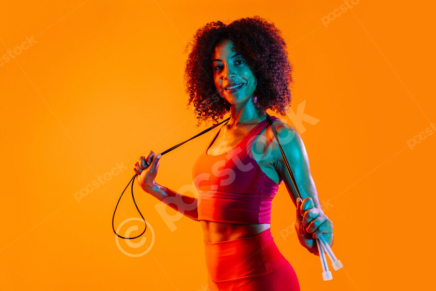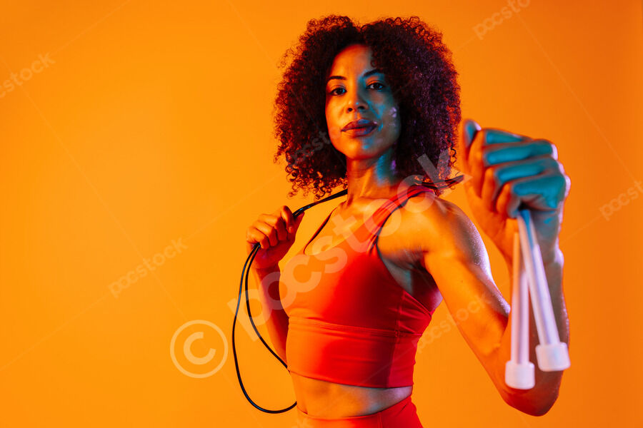 Muscular Hispanic woman with curly hair wearing workout clothes holding jumping rope around her neck while standing against orange background in studio